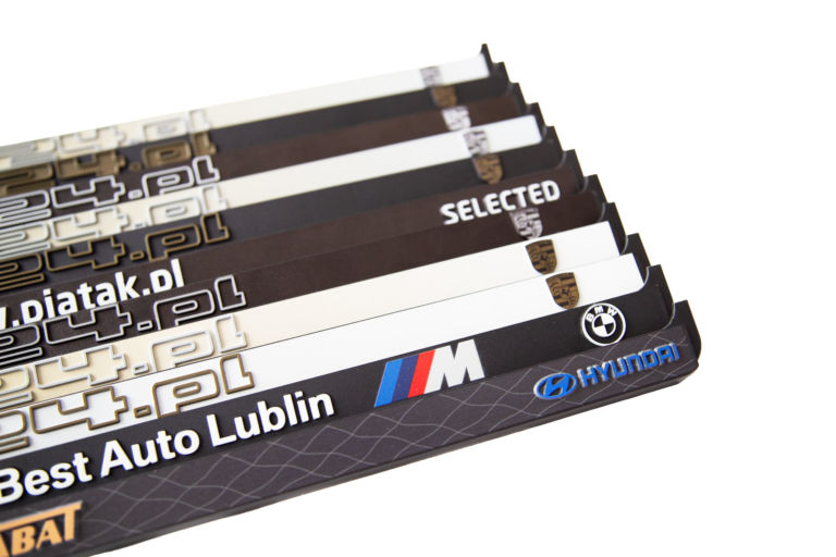 Die gewölbten Beschriftungen werden mit hochwertiger Heißprägefolie in verschiedenen Farben überzogen, wodurch der Halter sowohl ästhetisch, als auch beständig ist. Der 3D-Aufdruck wird auf die Befestigungsleisten durch unmittelbares Einspritzen des Kunststoffs in die Form aufgebracht.