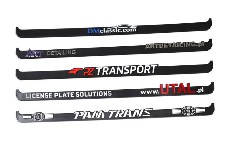 La portaplaca convexa 4D con una impresión digital es nuestra novedad en la oferta. Además del efecto convexo, el producto también muestra el efecto de extenderse por encima de la banda publicitaria, haciendo que su publicidad sea más visible, reconocible y realmente única. Podemos decorar las letras con un efecto de impresión digital mate. La impresión digital ofrece un reflejo preciso y realista de los colores de su logotipo u otros estándares gráficos de su publicidad, que los usuarios finales de la carretera estarán orgullosos de llevar en sus coches.