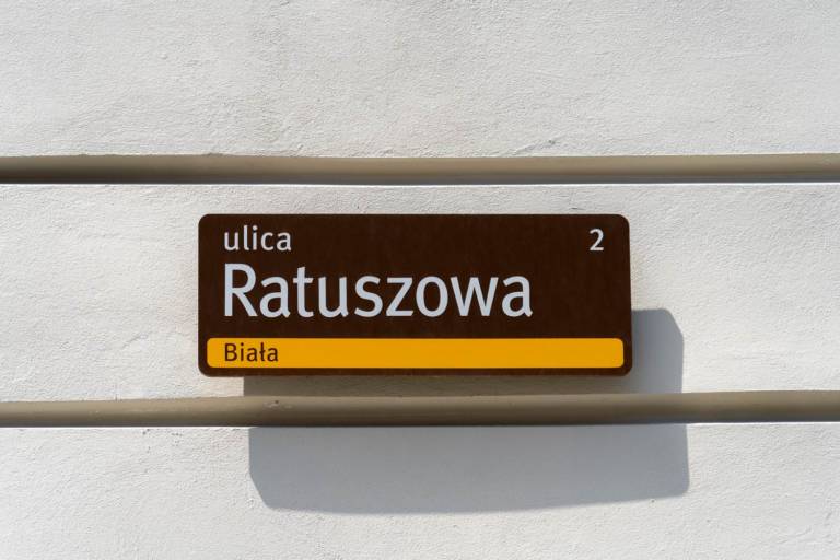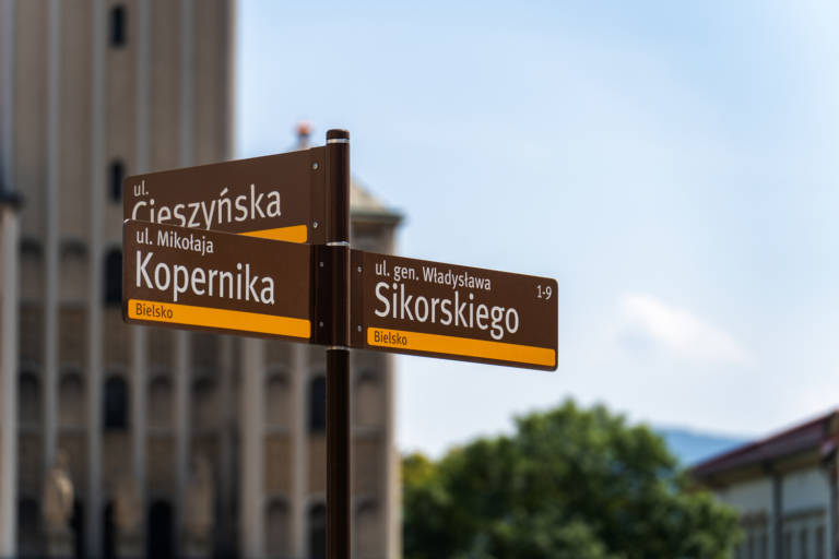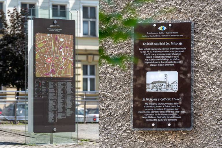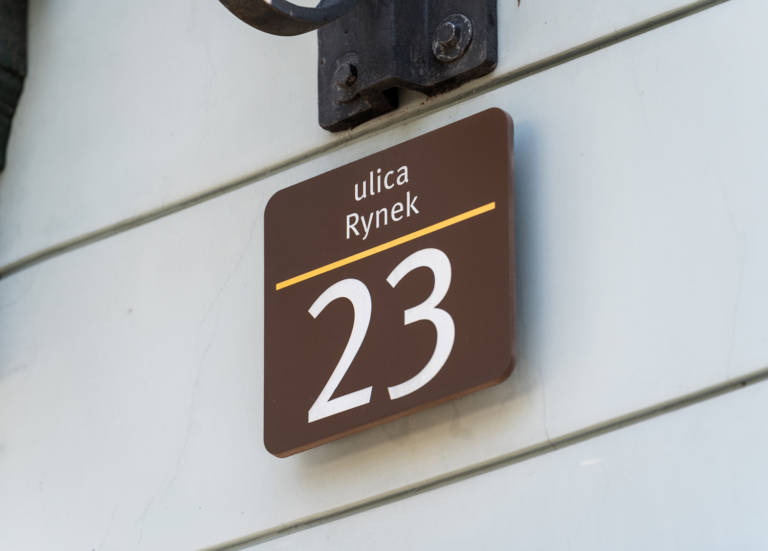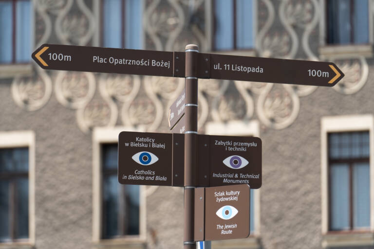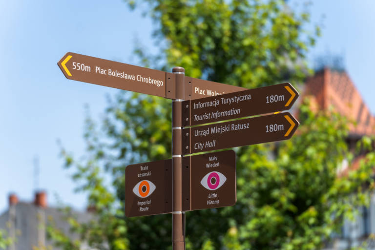 W projekcie nośników informacji rozróżniono historyczne centrum miasta od pozostałych dzielnic: centrum otrzymało kremowe napisy na brązowym tle, natomiast inne części miasta – brązowe napisy na kremowym tle, jednak w obu przypadkach z oznaczeniem dzielnicy na pomarańczowym tle. Dodatkowym atutem jest fakt, że tablice są dwujęzyczne: napisy umieszczono w języku polskim oraz w języku angielskim.